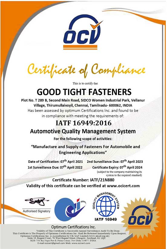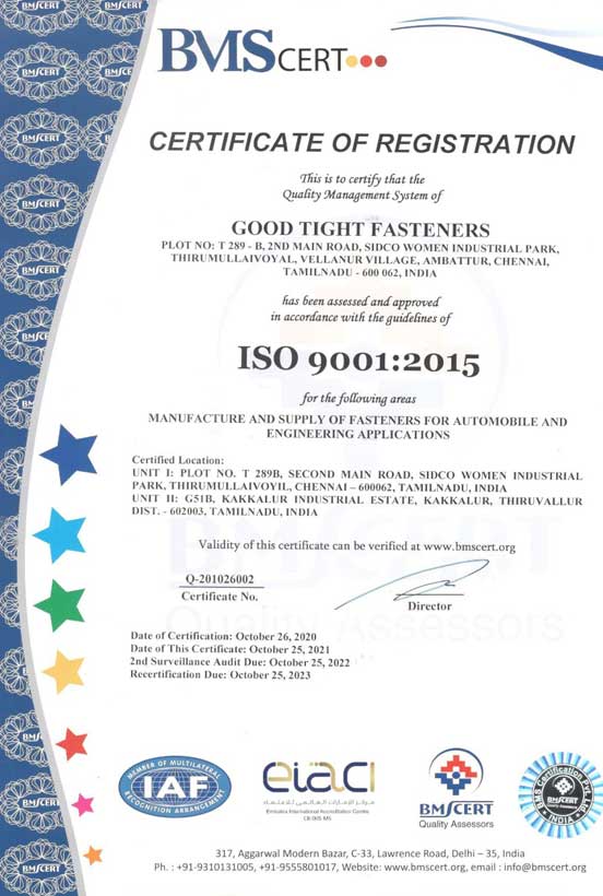 Good Tight Fasteners, an ISO 9001:2015 certified concern and promoted in the year of 2004 by a team of dedicated professionals for manufacture and supply of Cold Forged Nuts, Bolts, Rivets and other industrial fasteners to the leading automobile and accessory manufacturers. Our technicians are well experienced in Fasteners Industries for more than 25 years.